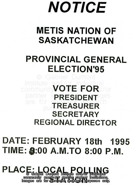 | Title: | Notice, Various Métis Nation of Saskatchewan Election Date, 1995 |