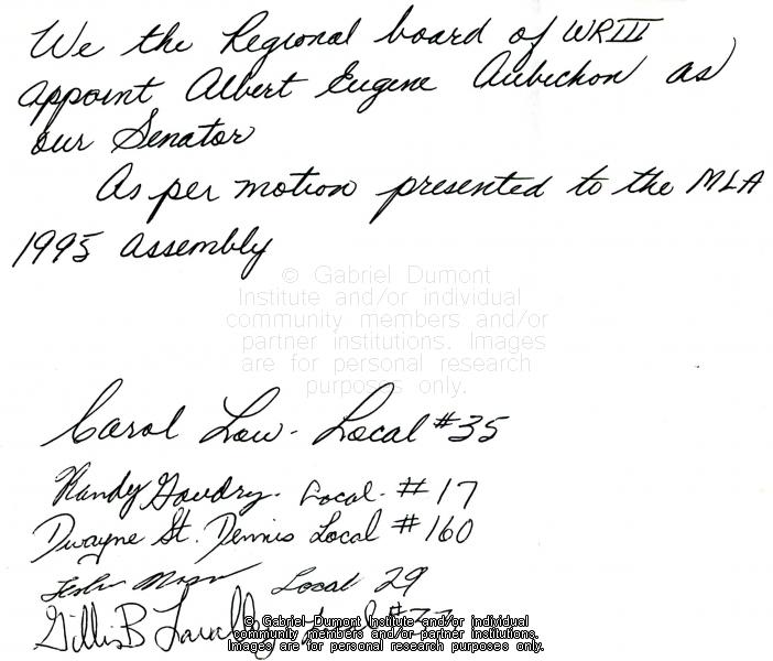 | Description: | This document is a signed motion by the board of the Métis Nation of Saskatchewan's Western Region III Board to appoint Albert Eugene Aubichon as their senator for the 1995 Métis Nation of Saskatchewan Legislative Assembly. |