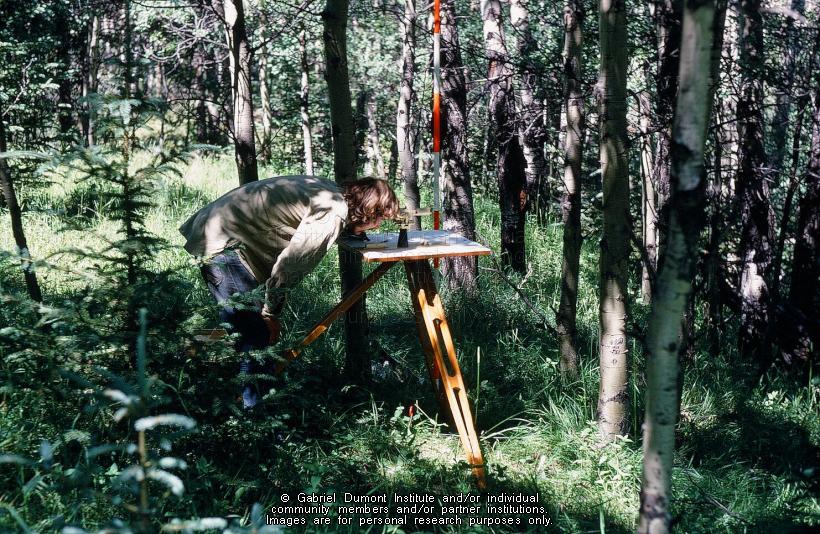 | Description: | This image is of the vegetation cover on the Kajewski Site. The site map being surveyed and drawn to scale. This image is part of a collection of 45 images used in a slideshow presentation by Jack Elliott of the Kajewski Site, Cabins B and E. Jack Elliott`s 1971 MA thesis—``Hivernant Archaeology in the Cypress Hills``—is based on an archaeological reconstruction of Cabins B and E of the Kajewski cabin site near Elkwater Alberta in the Cypress Hills. In this thesis, Jack Eliott analyzes the archaeological reconstruction of two Métis hivernant (``winterer``) cabins in the western half of the Cypress Hills. Hivernant is the French word for ``winterer,`` and in the Métis context refers to those Métis bison hunters and their families who settled during the winter in wooded, sheltered environments on the southern prairies such as the Cypress Hills, Wood Mountain, and Willow Bunch. These locales offered shelter from fierce prairie winters and provided game, wood, and fresh water. At the Kajewski site, Jack noticed that in the bison processing pits and in other areas of the cabin floors, there was a mixture of Euro-Canadian/American iron tools and older, Pre-Contact-style First Nation’s stone tools. At the time, archaeologists were puzzled by this mixture of tool cultures at the site and within its stratigraphy (the layer of sedimentation at an archaeological site), suggesting that the Métis at these wintering sites used the ``old`` and ``new`` tools interchangeably. Archaeologists thought it curious that the Métis hivernants willingly used stone tools when ``better`` iron tools were available to scrap bison hides and cut meat. Jack argued that the Métis used both tool types while his colleagues thought otherwise. This debate has continued to this day.