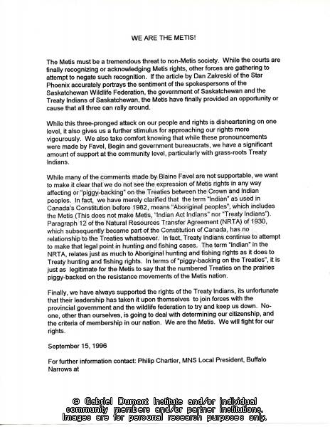 | Subject: | Buffalo Narrows, Chartier, Philip, Batoche, Metis Nation, Rights, Hunting, Harvesting |