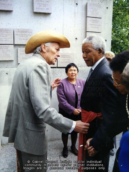 This is an image of John Boucher putting a Métis Sash around Nelson Mandela’s waist. On September 24, 1998 in Ottawa, Senator John Boucher (1938-2010), on behalf of the Métis Nation, wrapped a Métis sash around Nelson Mandela’s waist during the then President of South Africa’s state visit to Canada. When Mandela addressed Parliament later that day, he wore the sash. According to Boucher’s daughter, Dori Halcro, the late Métis senator was told not to touch the South African leader but he nixed that idea and tied the sash around Mandela’s waist and gave him the Métis name, “Diamant” (‘Diamond” in French) because Mandela was a luminous diamond who shone light on his people, and arguably on the entire world. Mandela was one of Boucher’s personal heroes; so this was a great thrill for him. This moment also drew the international spotlight of the world’s media on Canada’s relationship with the Métis. |