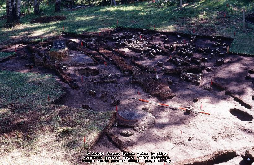 | Description: | This image is of a wide-angle shot of Cabin B at the Kajewski Site. This image is part of a collection of 45 images used in a slideshow presentation by Jack Elliott of the Kajewski Site, Cabins B and E. Jack Elliott`s 1971 MA thesis—``Hivernant Archaeology in the Cypress Hills``—is based on an archaeological reconstruction of Cabins B and E of the Kajewski cabin site near Elkwater Alberta in the Cypress Hills. In this thesis, Jack Eliott analyzes the archaeological reconstruction of two Métis hivernant (``winterer``) cabins in the western half of the Cypress Hills. Hivernant is the French word for ``winterer,`` and in the Métis context refers to those Métis bison hunters and their families who settled during the winter in wooded, sheltered environments on the southern prairies such as the Cypress Hills, Wood Mountain, and Willow Bunch. These locales offered shelter from fierce prairie winters and provided game, wood, and fresh water. At the Kajewski site, Jack noticed that in the bison processing pits and in other areas of the cabin floors, there was a mixture of Euro-Canadian/American iron tools and older, Pre-Contact-style First Nation’s stone tools. At the time, archaeologists were puzzled by this mixture of tool cultures at the site and within its stratigraphy (the layer of sedimentation at an archaeological site), suggesting that the Métis at these wintering sites used the ``old`` and ``new`` tools interchangeably. Archaeologists thought it curious that the Métis hivernants willingly used stone tools when ``better`` iron tools were available to scrap bison hides and cut meat. Jack argued that the Métis used both tool types while his colleagues thought otherwise. This debate has continued to this day.