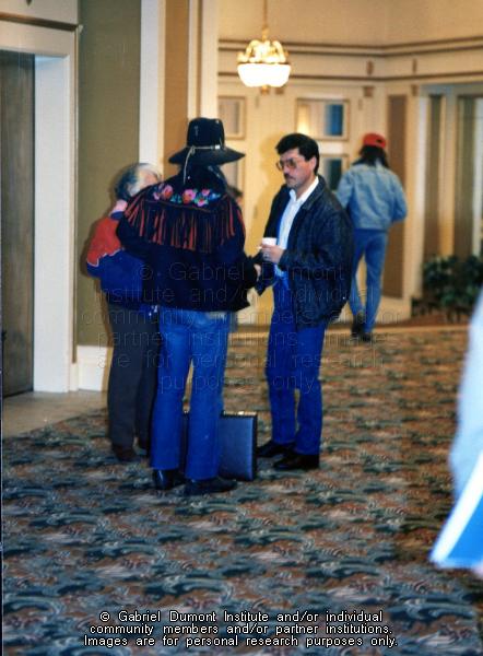 | Description: | This image is of Terry Lusty (back turned, with hat) and Will Campbell at a Métis Society of Saskatchewan conference in the winter of 1988-1989. |