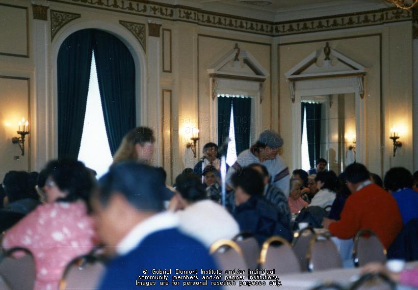 | Description: | This image is of Roy Fosseneuve (at the microphone) at a Métis Society of Saskatchewan conference in the winter of 1988-1989. |