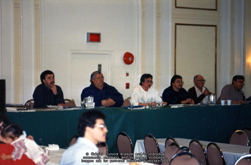 This image is of (left to right) Murray Hamilton, Clifford LaRocque, Ashley Norton, Gerald Morin, Harold Lajimodiere, and Albert Robillard at a Métis Society of Saskatchewan conference in the winter of 1988-1989. |