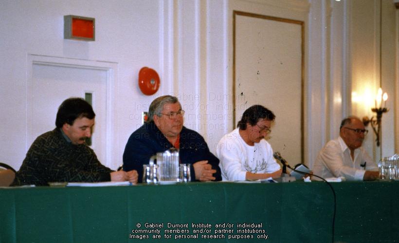 This image is of (left to right) Murray Hamilton, Clifford LaRocque and Ashley Norton(at the microphone) at a Métis Society of Saskatchewan conference in the winter of 1988-1989. |