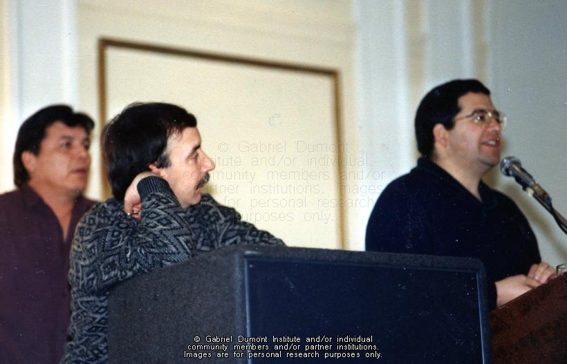 This image is of (left to right) Murray Hamilton, Philip Chartier, and Christopher Lafontaine at a Métis Society of Saskatchewan conference in the winter of 1988-1989. |