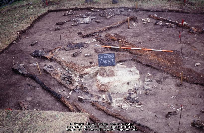 | Description: | This image is a wide-angle shot of Cabin E. This image is part of a collection of 45 images used in a slideshow presentation by Jack Elliott of the Kajewski Site, Cabins B and E. Jack Elliott`s 1971 MA thesis—``Hivernant Archaeology in the Cypress Hills``—is based on an archaeological reconstruction of Cabins B and E of the Kajewski cabin site near Elkwater Alberta in the Cypress Hills. In this thesis, Jack Eliott analyzes the archaeological reconstruction of two Métis hivernant (``winterer``) cabins in the western half of the Cypress Hills. Hivernant is the French word for ``winterer,`` and in the Métis context refers to those Métis bison hunters and their families who settled during the winter in wooded, sheltered environments on the southern prairies such as the Cypress Hills, Wood Mountain, and Willow Bunch. These locales offered shelter from fierce prairie winters and provided game, wood, and fresh water. At the Kajewski site, Jack noticed that in the bison processing pits and in other areas of the cabin floors, there was a mixture of Euro-Canadian/American iron tools and older, Pre-Contact-style First Nation’s stone tools. At the time, archaeologists were puzzled by this mixture of tool cultures at the site and within its stratigraphy (the layer of sedimentation at an archaeological site), suggesting that the Métis at these wintering sites used the ``old`` and ``new`` tools interchangeably. Archaeologists thought it curious that the Métis hivernants willingly used stone tools when ``better`` iron tools were available to scrap bison hides and cut meat. Jack argued that the Métis used both tool types while his colleagues thought otherwise. This debate has continued to this day.