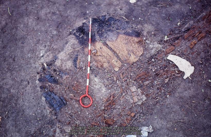 | Description: | This image is a of the Cabin E door sill. This image is part of a collection of 45 images used in a slideshow presentation by Jack Elliott of the Kajewski Site, Cabins B and E. Jack Elliott`s 1971 MA thesis—``Hivernant Archaeology in the Cypress Hills``—is based on an archaeological reconstruction of Cabins B and E of the Kajewski cabin site near Elkwater Alberta in the Cypress Hills. In this thesis, Jack Eliott analyzes the archaeological reconstruction of two Métis hivernant (``winterer``) cabins in the western half of the Cypress Hills. Hivernant is the French word for ``winterer,`` and in the Métis context refers to those Métis bison hunters and their families who settled during the winter in wooded, sheltered environments on the southern prairies such as the Cypress Hills, Wood Mountain, and Willow Bunch. These locales offered shelter from fierce prairie winters and provided game, wood, and fresh water. At the Kajewski site, Jack noticed that in the bison processing pits and in other areas of the cabin floors, there was a mixture of Euro-Canadian/American iron tools and older, Pre-Contact-style First Nation’s stone tools. At the time, archaeologists were puzzled by this mixture of tool cultures at the site and within its stratigraphy (the layer of sedimentation at an archaeological site), suggesting that the Métis at these wintering sites used the ``old`` and ``new`` tools interchangeably. Archaeologists thought it curious that the Métis hivernants willingly used stone tools when ``better`` iron tools were available to scrap bison hides and cut meat. Jack argued that the Métis used both tool types while his colleagues thought otherwise. This debate has continued to this day.
