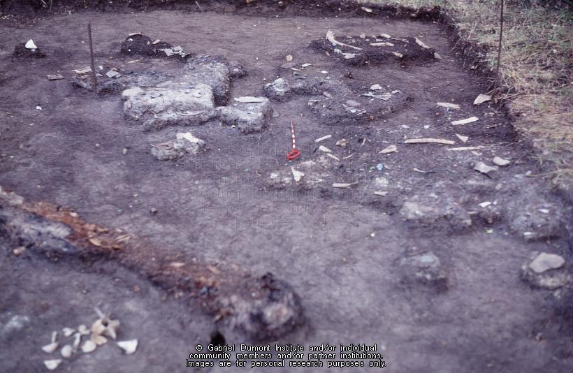 | Description: | This image is of a closer view of a Cabin E butchering activity area. This image is part of a collection of 45 images used in a slideshow presentation by Jack Elliott of the Kajewski Site, Cabins B and E. Jack Elliott`s 1971 MA thesis—``Hivernant Archaeology in the Cypress Hills``—is based on an archaeological reconstruction of Cabins B and E of the Kajewski cabin site near Elkwater Alberta in the Cypress Hills. In this thesis, Jack Eliott analyzes the archaeological reconstruction of two Métis hivernant (``winterer``) cabins in the western half of the Cypress Hills. Hivernant is the French word for ``winterer,`` and in the Métis context refers to those Métis bison hunters and their families who settled during the winter in wooded, sheltered environments on the southern prairies such as the Cypress Hills, Wood Mountain, and Willow Bunch. These locales offered shelter from fierce prairie winters and provided game, wood, and fresh water. At the Kajewski site, Jack noticed that in the bison processing pits and in other areas of the cabin floors, there was a mixture of Euro-Canadian/American iron tools and older, Pre-Contact-style First Nation’s stone tools. At the time, archaeologists were puzzled by this mixture of tool cultures at the site and within its stratigraphy (the layer of sedimentation at an archaeological site), suggesting that the Métis at these wintering sites used the ``old`` and ``new`` tools interchangeably. Archaeologists thought it curious that the Métis hivernants willingly used stone tools when ``better`` iron tools were available to scrap bison hides and cut meat. Jack argued that the Métis used both tool types while his colleagues thought otherwise. This debate has continued to this day.
