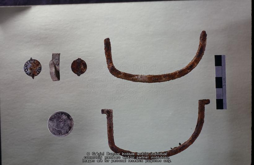 | Description: | This image is of trapping and commerce artifacts, including steel trap jaws, I. Orillard lead bale seal (note 3 parts), and a 1877 USA quarter dollar coin. This image is part of a collection of 45 images used in a slideshow presentation by Jack Elliott of the Kajewski Site, Cabins B and E. Jack Elliott`s 1971 MA thesis—``Hivernant Archaeology in the Cypress Hills``—is based on an archaeological reconstruction of Cabins B and E of the Kajewski cabin site near Elkwater Alberta in the Cypress Hills. In this thesis, Jack Eliott analyzes the archaeological reconstruction of two Métis hivernant (``winterer``) cabins in the western half of the Cypress Hills. Hivernant is the French word for ``winterer,`` and in the Métis context refers to those Métis bison hunters and their families who settled during the winter in wooded, sheltered environments on the southern prairies such as the Cypress Hills, Wood Mountain, and Willow Bunch. These locales offered shelter from fierce prairie winters and provided game, wood, and fresh water. At the Kajewski site, Jack noticed that in the bison processing pits and in other areas of the cabin floors, there was a mixture of Euro-Canadian/American iron tools and older, Pre-Contact-style First Nation’s stone tools. At the time, archaeologists were puzzled by this mixture of tool cultures at the site and within its stratigraphy (the layer of sedimentation at an archaeological site), suggesting that the Métis at these wintering sites used the ``old`` and ``new`` tools interchangeably. Archaeologists thought it curious that the Métis hivernants willingly used stone tools when ``better`` iron tools were available to scrap bison hides and cut meat. Jack argued that the Métis used both tool types while his colleagues thought otherwise. This debate has continued to this day.