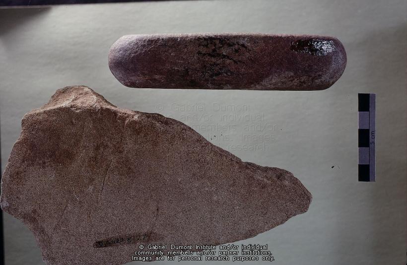 | Description: | This image is of whetstones used for sharpening steel trade tools. This image is part of a collection of 45 images used in a slideshow presentation by Jack Elliott of the Kajewski Site, Cabins B and E. Jack Elliott`s 1971 MA thesis—``Hivernant Archaeology in the Cypress Hills``—is based on an archaeological reconstruction of Cabins B and E of the Kajewski cabin site near Elkwater Alberta in the Cypress Hills. In this thesis, Jack Eliott analyzes the archaeological reconstruction of two Métis hivernant (``winterer``) cabins in the western half of the Cypress Hills. Hivernant is the French word for ``winterer,`` and in the Métis context refers to those Métis bison hunters and their families who settled during the winter in wooded, sheltered environments on the southern prairies such as the Cypress Hills, Wood Mountain, and Willow Bunch. These locales offered shelter from fierce prairie winters and provided game, wood, and fresh water. At the Kajewski site, Jack noticed that in the bison processing pits and in other areas of the cabin floors, there was a mixture of Euro-Canadian/American iron tools and older, Pre-Contact-style First Nation’s stone tools. At the time, archaeologists were puzzled by this mixture of tool cultures at the site and within its stratigraphy (the layer of sedimentation at an archaeological site), suggesting that the Métis at these wintering sites used the ``old`` and ``new`` tools interchangeably. Archaeologists thought it curious that the Métis hivernants willingly used stone tools when ``better`` iron tools were available to scrap bison hides and cut meat. Jack argued that the Métis used both tool types while his colleagues thought otherwise. This debate has continued to this day.