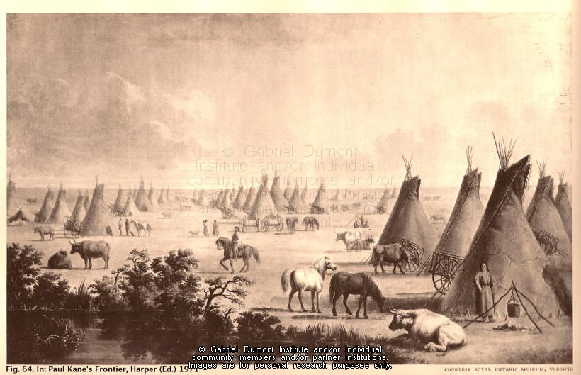 | Description: | This image is of a brigade out hunting, Paul Kane sketches of Red River cart & harnessed ox as primary brigade vehicle, putting up camp, camp scene, brigade leaders meeting before a hunt. This image is part of a slide show presentation by Jack Elliott relating to Métis hivernant bison hunters and hide workers in the Cypress Hills. The 24 images in this collection scans of published Paul Kane paintings and sketches (#7-11, 14-15), photos from Boissevain Community Archives (#3-5), artifact photos from the Kajewski Site (as described above #12-13, 20, 22-24) and various other scans and images — as referenced or described in the slide show talk notes, and 4 copies of informant permissions for published use of interviews. Jack Elliott`s 1971 MA thesis—``Hivernant Archaeology in the Cypress Hills``—is based on an archaeological reconstruction of Cabins B and E of the Kajewski cabin site near Elkwater Alberta in the Cypress Hills. In this thesis, Jack Eliott analyzes the archaeological reconstruction of two Métis hivernant (``winterer``) cabins in the western half of the Cypress Hills. Hivernant is the French word for ``winterer,`` and in the Métis context refers to those Métis bison hunters and their families who settled during the winter in wooded, sheltered environments on the southern prairies such as the Cypress Hills, Wood Mountain, and Willow Bunch. These locales offered shelter from fierce prairie winters and provided game, wood, and fresh water. At the Kajewski site, Jack noticed that in the bison processing pits and in other areas of the cabin floors, there was a mixture of Euro-Canadian/American iron tools and older, Pre-Contact-style First Nation’s stone tools. At the time, archaeologists were puzzled by this mixture of tool cultures at the site and within its stratigraphy (the layer of sedimentation at an archaeological site), suggesting that the Métis at these wintering sites used the ``old`` and ``new`` tools interchangeably. Archaeologists thought it curious that the Métis hivernants willingly used stone tools when ``better`` iron tools were available to scrap bison hides and cut meat. Jack argued that the Métis used both tool types while his colleagues thought otherwise. This debate has continued to this day.