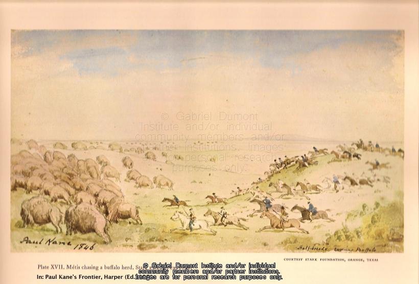 | Description: | This image is a of a Paul Kane watercolor and sketch of Métis hunting buffalo near Ft. Edmonton in 1846. This image is part of a slide show presentation by Jack Elliott relating to Métis hivernant bison hunters and hide workers in the Cypress Hills. The 24 images in this collection scans of published Paul Kane paintings and sketches (#7-11, 14-15), photos from Boissevain Community Archives (#3-5), artifact photos from the Kajewski Site (as described above #12-13, 20, 22-24) and various other scans and images — as referenced or described in the slide show talk notes, and 4 copies of informant permissions for published use of interviews. Jack Elliott`s 1971 MA thesis—``Hivernant Archaeology in the Cypress Hills``—is based on an archaeological reconstruction of Cabins B and E of the Kajewski cabin site near Elkwater Alberta in the Cypress Hills. In this thesis, Jack Eliott analyzes the archaeological reconstruction of two Métis hivernant (``winterer``) cabins in the western half of the Cypress Hills. Hivernant is the French word for ``winterer,`` and in the Métis context refers to those Métis bison hunters and their families who settled during the winter in wooded, sheltered environments on the southern prairies such as the Cypress Hills, Wood Mountain, and Willow Bunch. These locales offered shelter from fierce prairie winters and provided game, wood, and fresh water. At the Kajewski site, Jack noticed that in the bison processing pits and in other areas of the cabin floors, there was a mixture of Euro-Canadian/American iron tools and older, Pre-Contact-style First Nation’s stone tools. At the time, archaeologists were puzzled by this mixture of tool cultures at the site and within its stratigraphy (the layer of sedimentation at an archaeological site), suggesting that the Métis at these wintering sites used the ``old`` and ``new`` tools interchangeably. Archaeologists thought it curious that the Métis hivernants willingly used stone tools when ``better`` iron tools were available to scrap bison hides and cut meat. Jack argued that the Métis used both tool types while his colleagues thought otherwise. This debate has continued to this day.