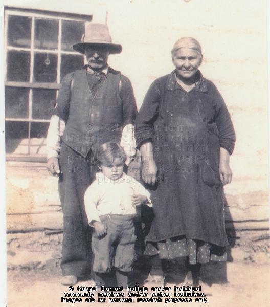 | Description: | This image is of Patrice Dumont and his wife Marie Louise Patenaude with their grandson, Tchitum (Alec). They were living near Duck Lake, Saskatchewan when this picture was taken.