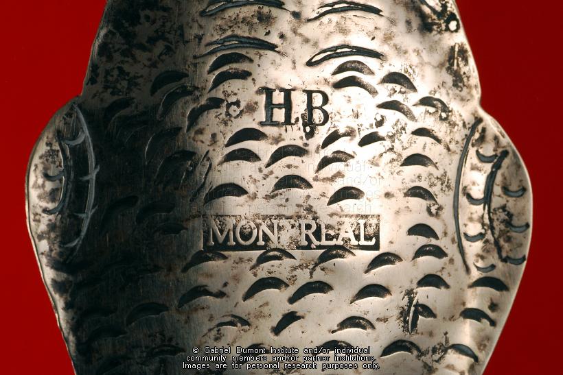 Description: This image is of a replica silver fish HBC trade effigy. It’s marked with an "HB." This artifact is part of the Gabriel Dumont Institute collection.