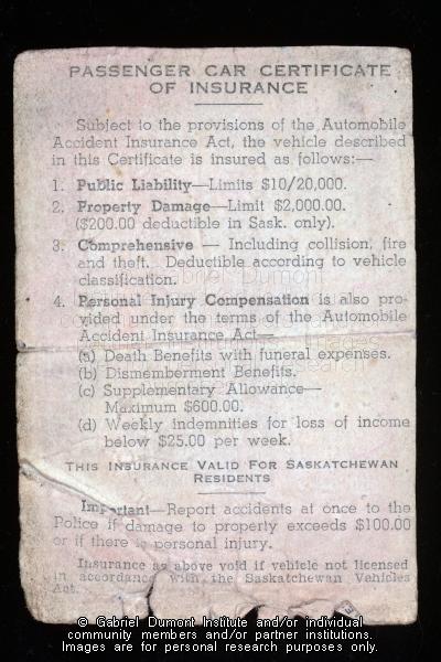 This is an image of Saskatchewan Taxi Registration Certificate from 1955. Edward (“Ed’) Dumont was a veteran of the Second World War. This collection was donated to the Gabriel Dumont Institute by his niece, Elsie (Dumont) Busby and her husband, Berry Busby. |