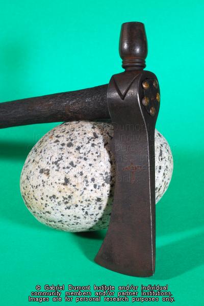 This image is of a replica ceremonial tomahawk and pipe. The pipe has a cartouche of a turtle on it. It was likely made from 200-year-old oak. Pipe part has tobacco residue in it. This artifact is part of the Gabriel Dumont Institute collection. |