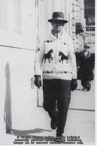 This is an image of Edmond Boyer (1898-1966) wearing a Siwash sweater made by his daughter, Estelle Boyer (1935-2012). Edmond's wife, Berthe (1900-1967) also made Siwash sweaters. This image was donated to the Institute by Brenda (Boyer) Percell. The original source of this image is Estelle Boyer. Edmond was Brenda’s grandfather. This image must not be reproduced. |