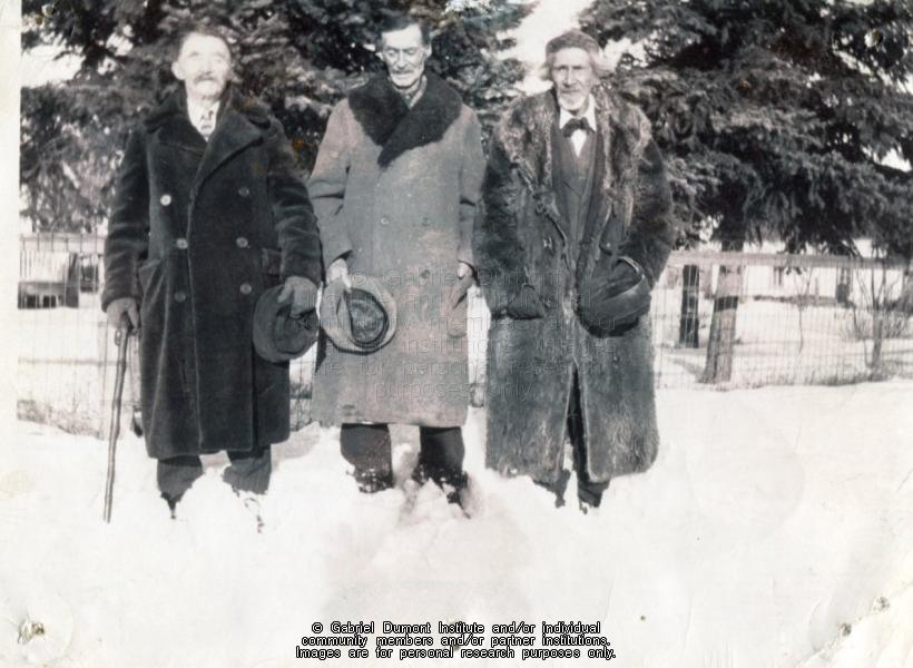 | Description: | Photograph of Patrice Fleury, William Kennedy, and Chas. Laviolette standing in a snow bank. This image has been graciously provided by the Duck Lake Regional Interpretive Centre for use on this website. It is available for research purposes only. The reproduction of this image in whole or in part is strictly prohibited without the permission of the copyright holder.