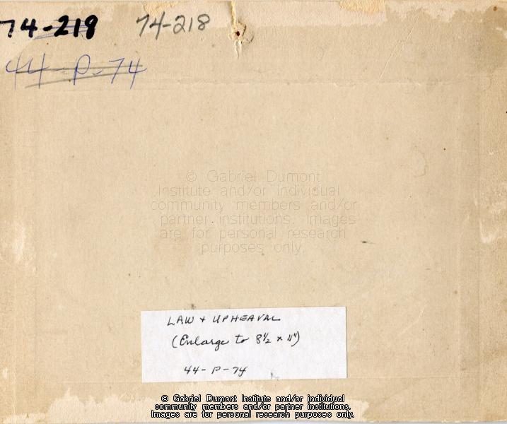 | Description: | Back of photograph of two women sitting in a Red River cart being pulled by a horse. This image has been graciously provided by the Duck Lake Regional Interpretive Centre for use on this website. It is available for research purposes only. The reproduction of this image in whole or in part is strictly prohibited without the permission of the copyright holder. |