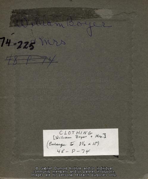 | Description: | Back of photograph of Mr. and Mrs. William Boyer. This image has been graciously provided by the Duck Lake Regional Interpretive Centre for use on this website. It is available for research purposes only. The reproduction of this image in whole or in part is strictly prohibited without the permission of the copyright holder. |