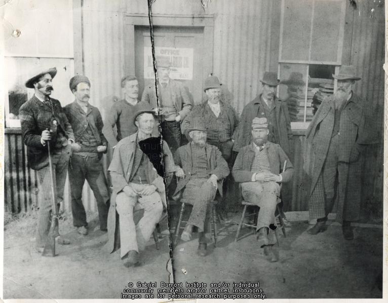 Photograph of Duck Lake "oldtimers": George Fisher, Damas Racette, Gus Fornier, W.S. Urton, [?] St Louis, Patrice Parenteau, R.S. Mackenzie, R.S. Eugene Boucher (Conservative Member for Batoche), Xavier Letendre (Mr. Batoche, merchant), W.J. Pozer (Merchant from Duck Lake). This image has been graciously provided by the Duck Lake Regional Interpretive Centre for use on this website. The reproduction of this image in whole or in part is strictly prohibited without the permission of the copyright holder. |