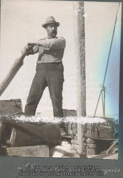 Description: Steersman of the York boat carrying the Half-Breed Commissioners throughout Saskatchewan, 1900. This image has been graciously provided by the Duck Lake Regional Interpretive Centre for use on this website. It is available for research purposes only. The reproduction of this image in whole or in part is strictly prohibited without the permission of the copyright holder.