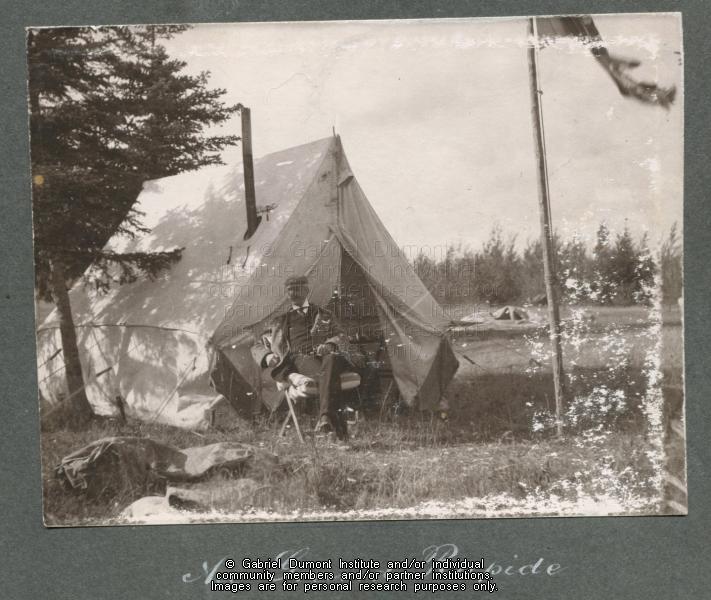 | Description: | Half-Breed Commissioner [N.O. Côté], sitting outside a tent at the camp at Grand Rapids, MB, 1900. |