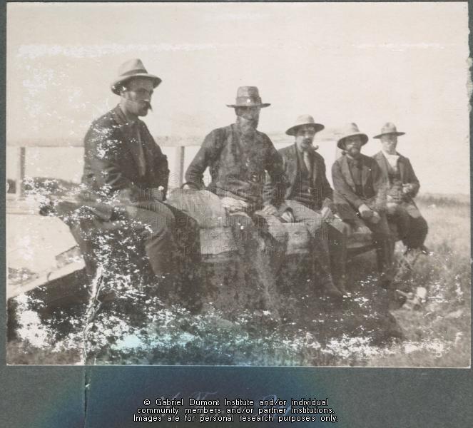 A group of five men (possibly Half-Breed Commissioners) seated on the end of a barge, Fort Pitt NWT, 1900. This image has been graciously provided by the Duck Lake Regional Interpretive Centre for use on this website. It is available for research purposes only. The reproduction of this image in whole or in part is strictly prohibited without the permission of the copyright holder. |