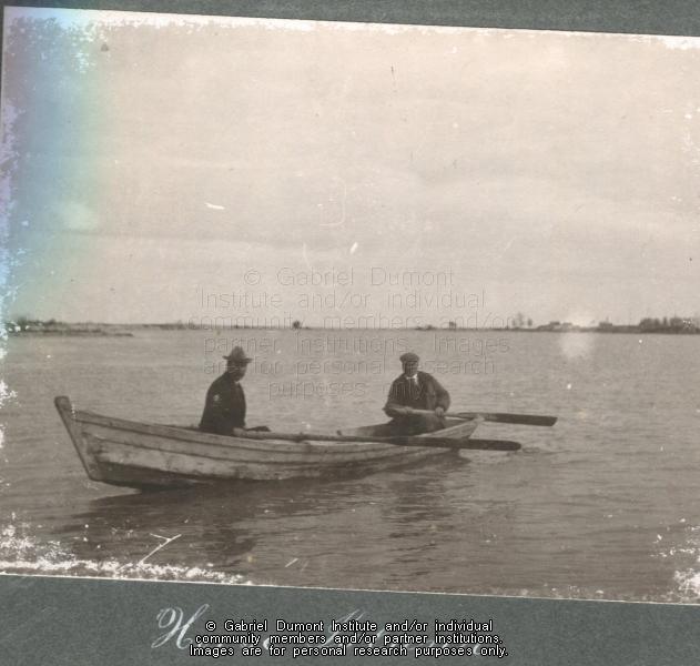 | Description: | Two unidentified men in a York Boat on Horse Island, Lake Winnipeg, 1900. This image has been graciously provided by the Duck Lake Regional Interpretive Centre for use on this website. It is available for research purposes only. The reproduction of this image in whole or in part is strictly prohibited without the permission of the copyright holder. |