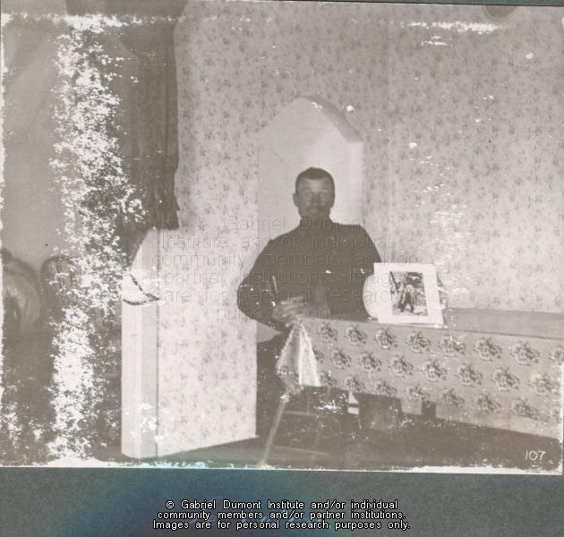 Description: Man seated at a table in the interior of a house, 1900. This appears to be the Minnesota migrant referred to in a related photograph in the album. This image has been graciously provided by the Duck Lake Regional Interpretive Centre for use on this website. It is available for research purposes only. The reproduction of this image in whole or in part is strictly prohibited without the permission of the copyright holder.