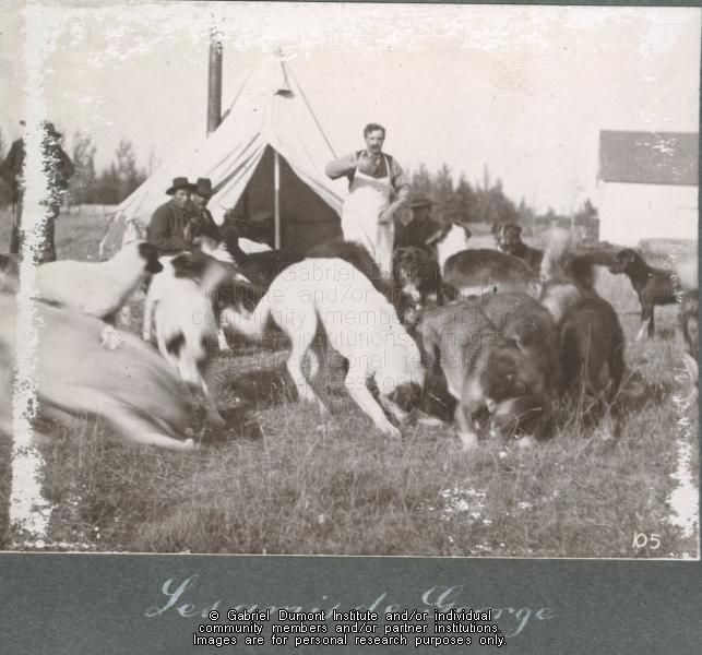 Description: View of men seated outside commission's tents, with one man feeding a group of dogs, 1900. This image has been graciously provided by the Duck Lake Regional Interpretive Centre for use on this website. It is available for research purposes only. The reproduction of this image in whole or in part is strictly prohibited without the permission of the copyright holder.