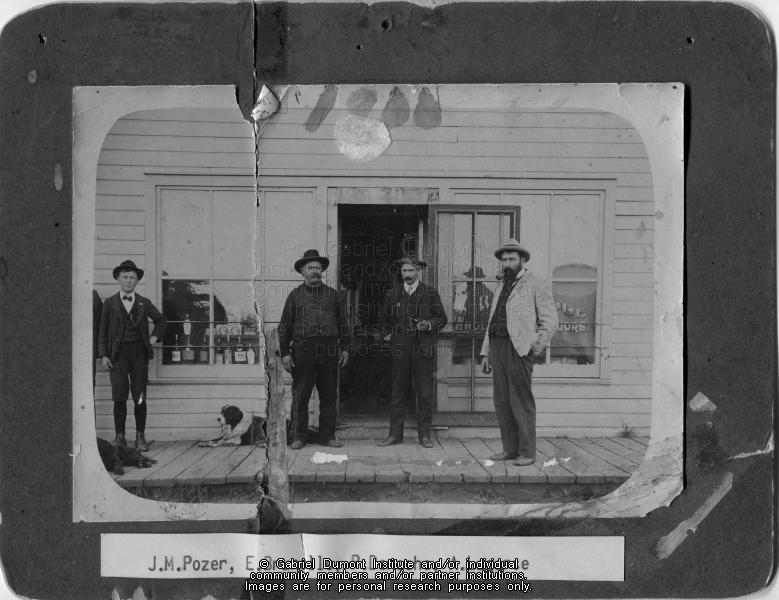 | Description: | Photograph of James Pozer, E. Brunelle, Pete Deroche, A. Lagarce (and a dog) in front of a storefront.