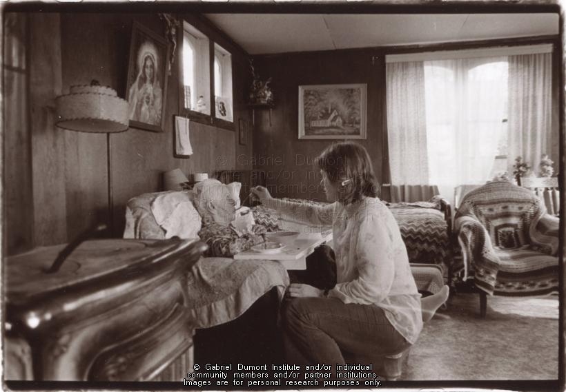 | Description: | Photograph of an unidentified woman feeding Mary Louise Arcand.