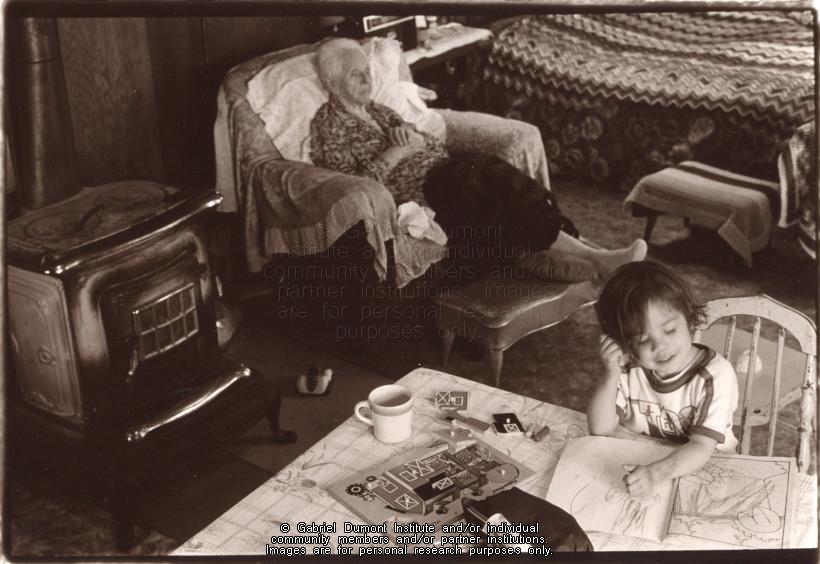| Description: | Photograph of Mary Louise Arcand setting in a chair in her home. An unidentified child sits with a colouring book and puzzle at a table.