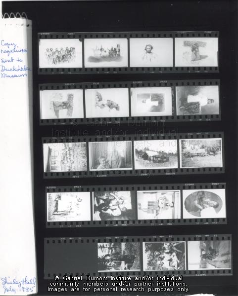 | Description: | Slide contact sheets containing 19 photographs taken by Shirley Hall at Duck Lake in July 1985. These appear to be images taken of other photographs or images, mostly of individuals.