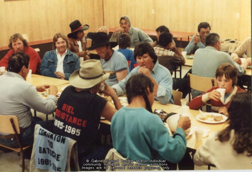 | Description: | Photograph of the members of the Back to Batoche Alberta Wagon Train members eating a meal at the Duck Lake Métis Centre.