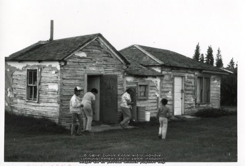 | Description: | Photograph of wooden house with four unidentified individuals walking in front of it.