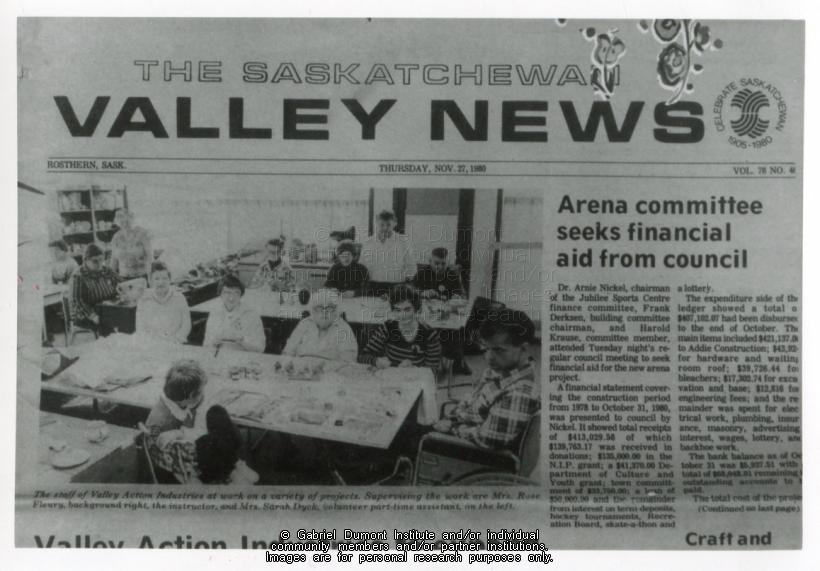 Excerpt from front page of The Saskatchewan Valley News [Rosthern, Sask.] from November 27, 1980. Photograph on front pages includes Rose Fleury with the staff of Valley Action Industries. This image has been graciously provided by the Duck Lake Regional Interpretive Centre for use on this website. It is available for research purposes only. The reproduction of this image in whole or in part is strictly prohibited without the permission of the copyright holder. |