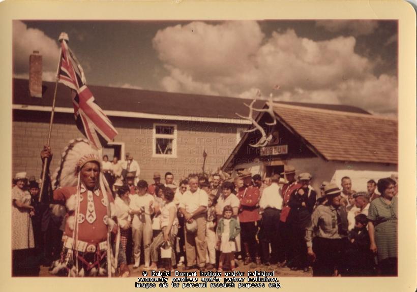 | Description: | Crowd gathered outside the Duck Lake Museum for its opening celebration.