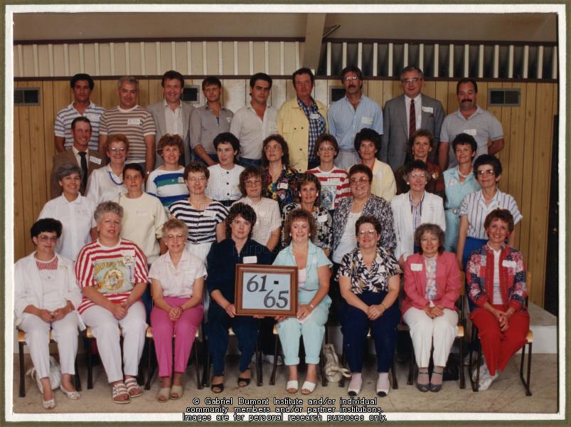 Back row left to right: Horvath, Robert; Baribeau, Lionel; Pelletier, Gilbert; Doucette, [unknown]; Lenz, [unknown]; Davez, Lyle; Fiolleau, Alain; Lanovaz, Laurent; Piche, Lucien; Third row from left to right: Perillat, Paul; Friesen, Dolores (Piche); Colleaux, Jacqueline (Pelletier); Jacobson, Micheline (Perrin); Raeve, Murielle (Pogu); Viden, Rosemarie (Fiolleau); Fiolleau, Celine (Bergeron); [unknown], Lillian (Koett); [unknown], Pauline (Smith); Second row left to right: Baribeau, Elaine (Arcand); Roden, Diane (Pogu); Dion, Sylvia (Pelletier); Magnusson, Denise (Perillat); Bell, Lucille (Folliet); [Unknown], Noella (Laroque); Pelletier, Annette (Lanovaz); [unknown], Lorraine (Pajot); First row left to right: Courchene, Rachelle (Poirier); Parenteau, Sylvia (Blanchard); Wirgis, Elaine (Baribeau); [unknown]; Doeptuk, Phyllis (Hood); [Unknown], Diane (Doucette); Mercereau, Suzanne; [Unknown], Marilyn (Koett) This image has been graciously provided by the Duck Lake Regional Interpretive Centre for use on this website. It is available for research purposes only. The reproduction of this image in whole or in part is strictly prohibited without the permission of the copyright holder. |