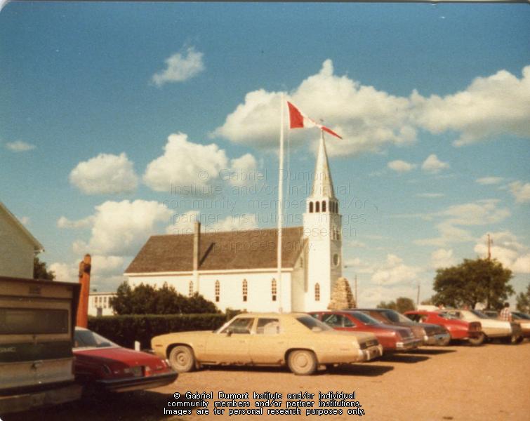| Description: | Cars parked in a row in front of church. Duck Lake.