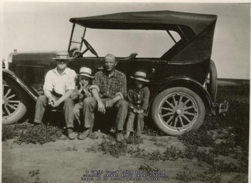 | Description: | Photograph of two men and two children seated in front of a car. This image has been graciously provided by the Duck Lake Regional Interpretive Centre for use on this website. It is available for research purposes only. The reproduction of this image in whole or in part is strictly prohibited without the permission of the copyright holder. |