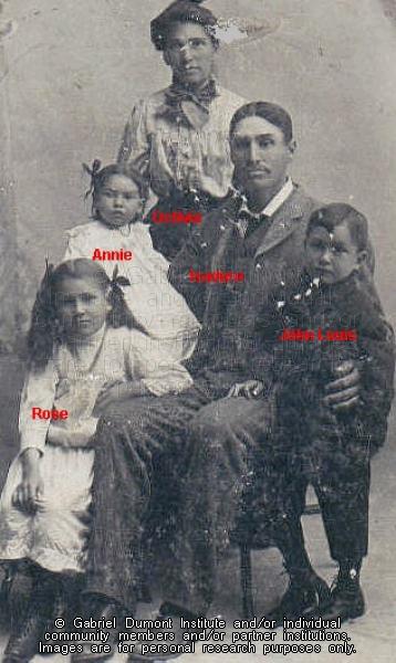 This is an image of Isadore Landry (1875–1962), Octavia Swan (1877–1972) and their children: Annie, Rose, and Louis John. This image was donated to the Gabriel Dumont Institute by Seneca Landrie. The original source of this image rests with the Landrie family. This image must not be reproduced and can only be used for reference purposes only. |