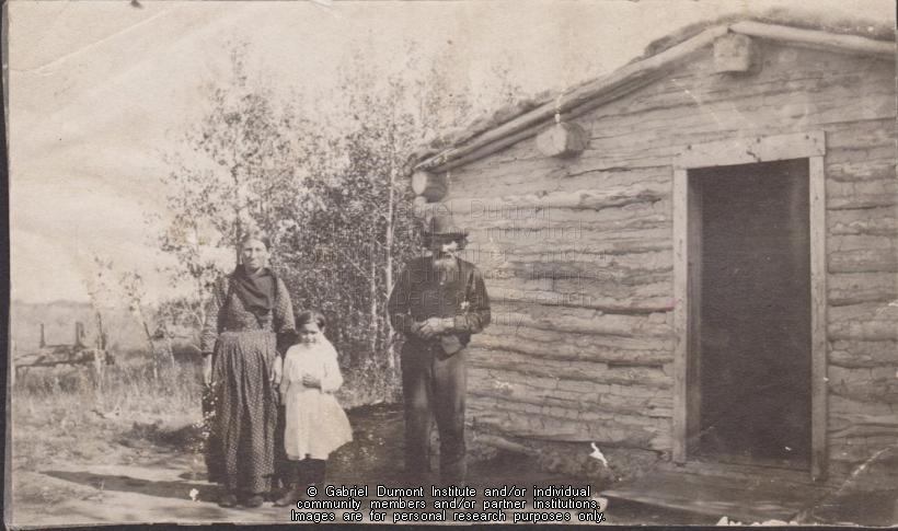 with their grandchild at their homestead in Round Prairie, Saskatchewan. This image was donated to the Gabriel Dumont Institute by Seneca Landrie. The original source of this image rests with the Landrie family. This image must not be reproduced and can only be used for reference purposes only. |