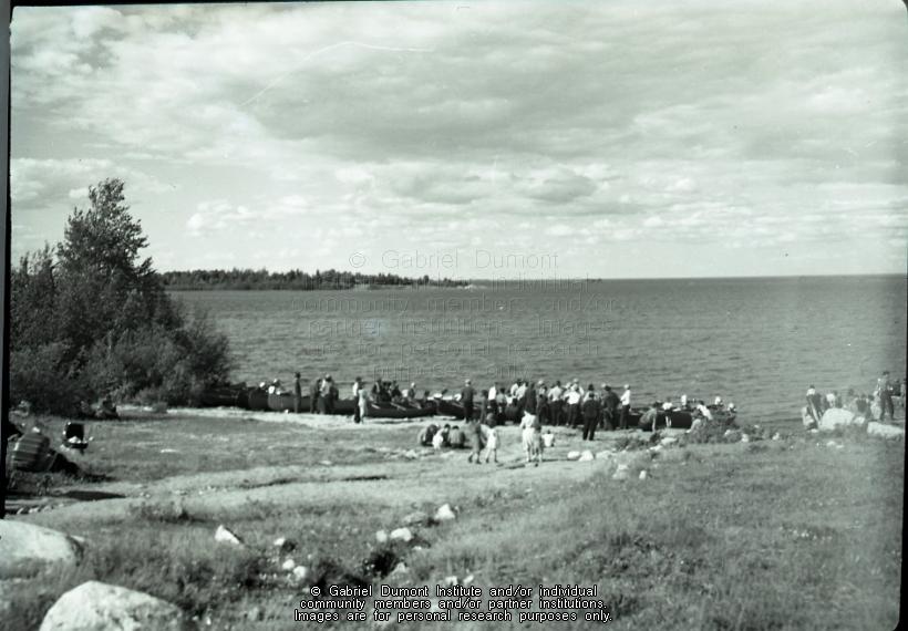 This photograph of the canoe race and other boats were likely taken on La Ronge Lake. The Gabriel Dumont Institute thanks Teron Roberts, John and Margaret Irving, and Anne Hrynuik for providing the correct descriptive information for this photograph. |