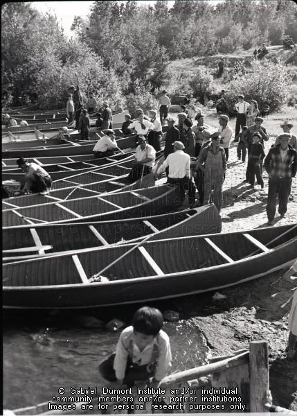This photograph of the canoe race and other boats were likely taken on La Ronge Lake. The Gabriel Dumont Institute thanks Teron Roberts, John and Margaret Irving, and Anne Hrynuik for providing the correct descriptive information for this photograph. |